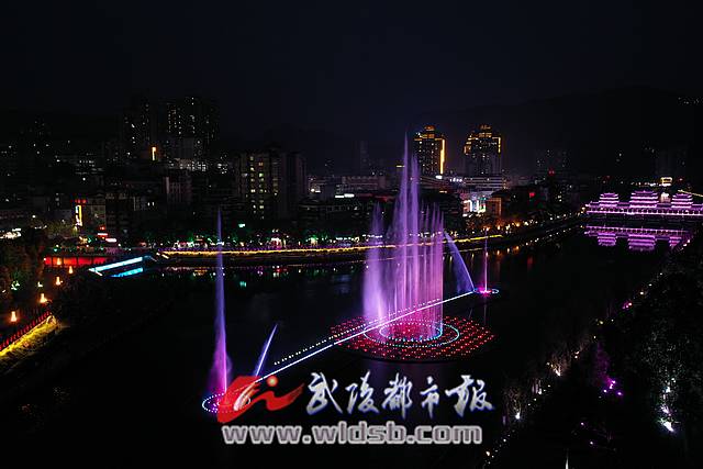 随着夜幕降临,华灯初上,靓丽的“城市客厅”映入眼帘。在这里,以“中国峡谷城·武陵会客厅”为主题的音乐喷泉融入黔江独特的自然、人文景观,营造出了一幅“山水在城中,城在画卷里”的水舞光影视听盛宴。